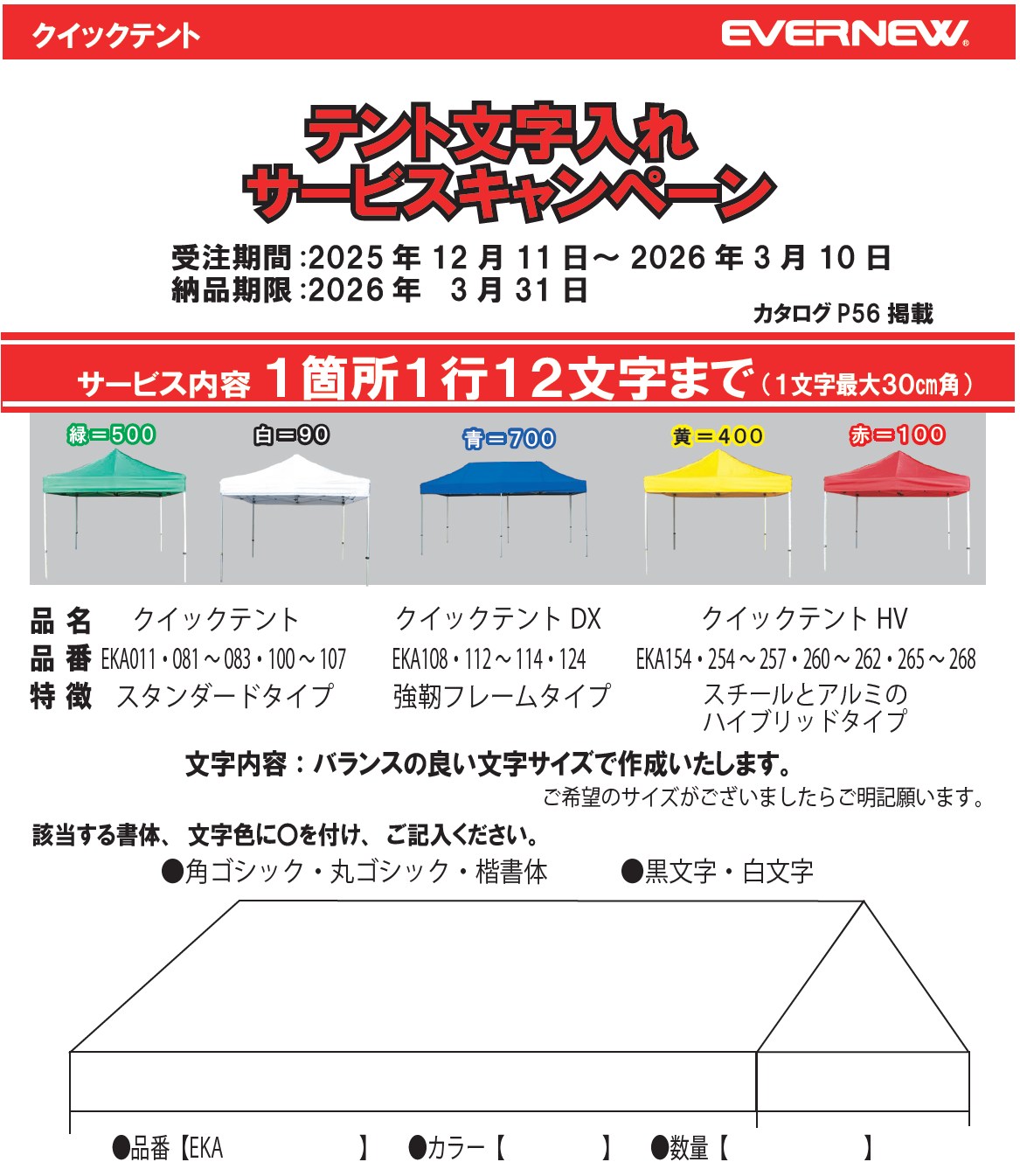 株式会社エバニュー製の「クイックテント」に関しまして、例年ご好評をいただいております「テント文字入れサービスキャンペーン」が今年も開催されます。学校や役所、地域活動などで使用されるテントに、チーム名や団体名を印字する絶好の機会です。
